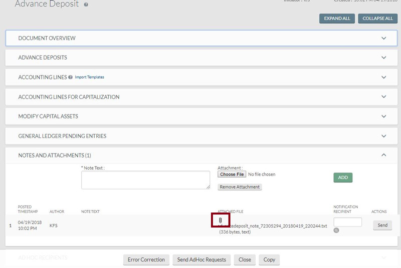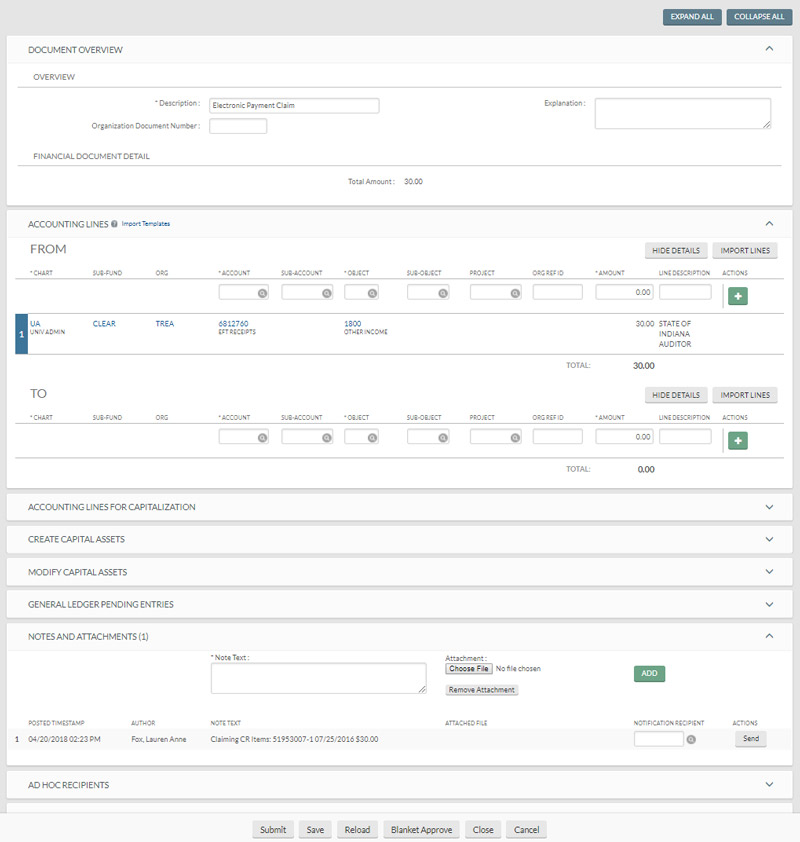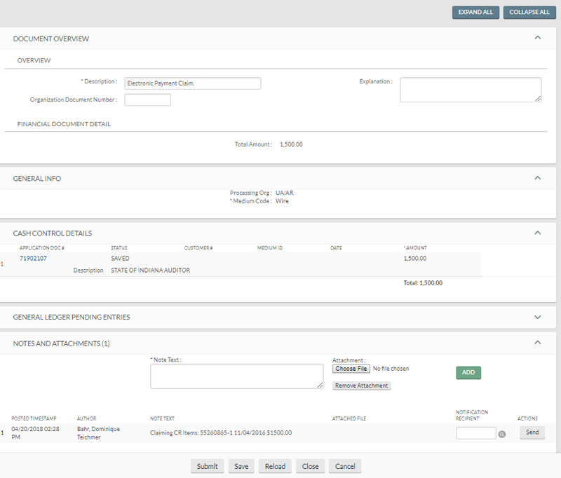 Information identifying the payment claimed is automatically added to the Notes field of this document. The document should be completed and routed as normal. The document will route to Treasury. Do not manually forward the document.