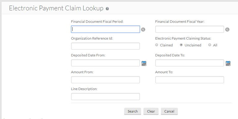 Payments can be searched for by the fiscal year, fiscal period, deposit date range, amount range, org reference id, line description and by the status of a payment, i.e. unclaimed, claimed, or all.