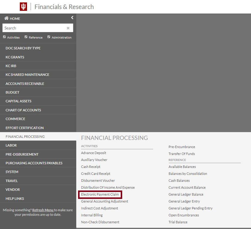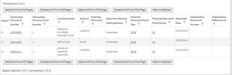 Electronic payments to IU departments will be claimed through a special KFS interface that is referred to as the Electronic Payment Claim Table. Each electronic payment will be posted to the claim table by an auto-generated Advanced Deposit document (AD) created directly from the bank file. Each payment will be added to the list of unclaimed payments in the claim table after the overnight refresh of the KFS. Payments should be available to claim no later than noon.
