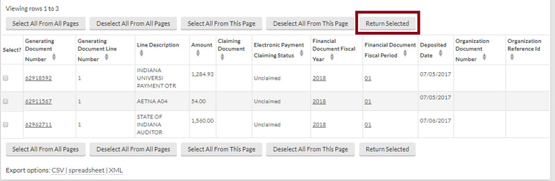 To make a claim, select the check box next to the payment you've identified and click the "return selected" button. To claim more than one payment, just select multiple check boxes before clicking "return selected."