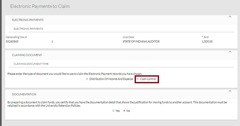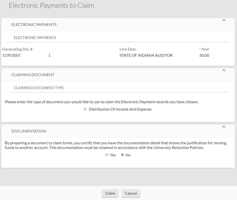 After indicating that you have documentation, you will be presented with options for claiming the payment. Most users will use a Distribution of Income/Expense document (DI) to claim payments.