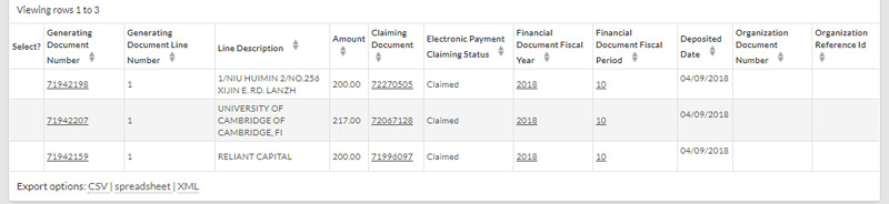 Once payments have been claimed they will also display the document number and status of the transaction used to claim them.