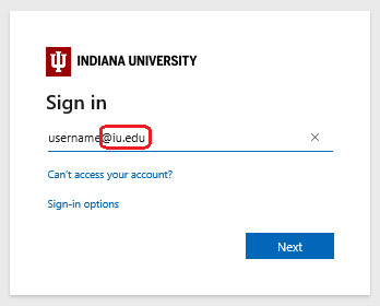 Treasury trainings have a new login interface. After clicking the link, you will see an IU branded sign in field that requires your IU username, followed by @iu.edu. It is important to use @iu.edu instead of @indiana.edu, @iun.edu, etc. After you enter your @iu.edu address, then click the Next button.